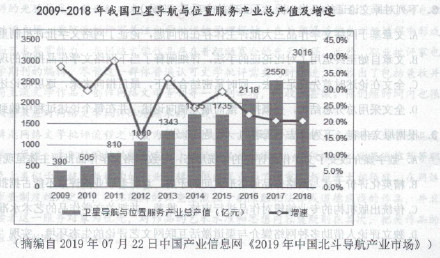 【试题分析】材料一介绍了北斗卫星系统的在我国各行业的应用,可以概括出第一点。材料二的图表为“2009-2018年我国卫星导航与位置服务产业总产值及增速”,总产值的持续增长,北斗系统功不可没。材料三主要介绍北斗系统在“一带一路”国家的应用,可以得出第三点。